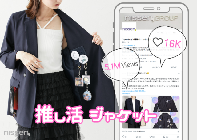 ニッセンからは、お仕事中に “推し”と過ごせるウェアも登場中です♪ こちらもパッと見は定番のダブルジャケットながら、内部には缶バッジやアクスタをしまえるポケットを8つも搭載!