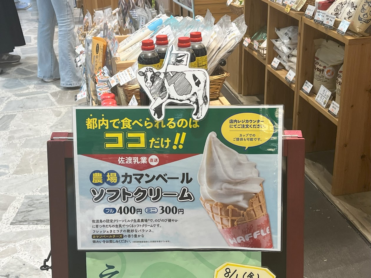 佐渡島の農場で育った牛たちの生乳でつくっているという、佐渡乳業直送「農場カマンベールソフトクリーム」(フル400円 / ミニ300円)。なんと都内で食べられる場所はここだけ!なのだそうです。