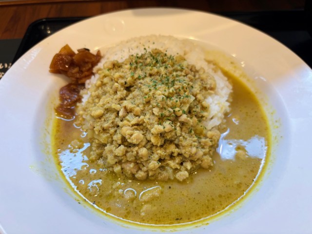2025年8月5日から販売がスタートしたドライグリーンカレー。1皿で「ドライ」と「スープ」という2つの食感のカレーを楽しめるのが魅力だそうです。