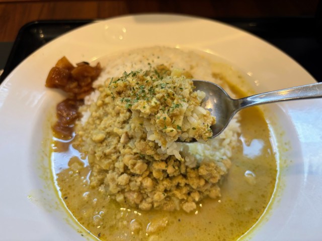 ではでは、まずは豚ひき肉とたけのこを使った「ドライ」からいただいてみましょう♪ ……そぼろのような柔らかな肉の食感にスパイシーなカレー味が加わり、噛むたびに口の中に旨味があふれます。
