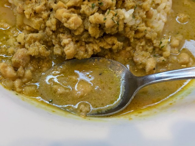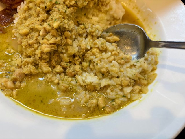 いっぽう、「スープ」のほうはサラサラしているのが特徴的。スプーンですくって口にすると、こちらは青唐辛子のピリッとした刺激とココナッツミルクのまろやかさが際立ちます。