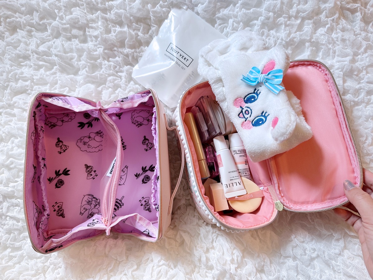 これを詰め替えてみると……折りたたみブラシ・試供品サイズのシャントリ・スキンケア・コットン・薄めのヘアターバンなどが、中サイズにすっきり収まりました。これからリトルミイと一緒に旅に出るのが楽しみ!