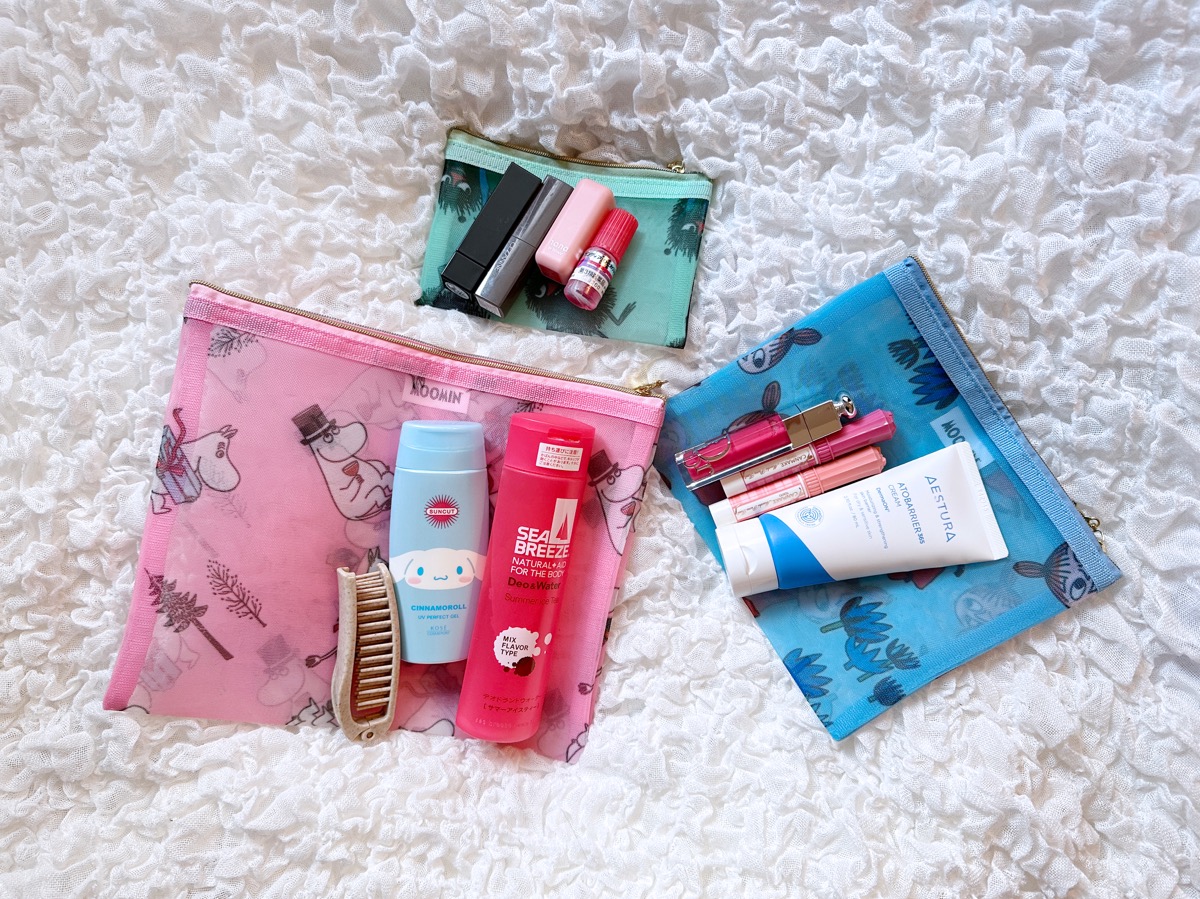 私は1泊の取材旅行だと、スキンケアやヘアケアは試供品サイズのものをメッシュポーチにまとめて詰め込んで持っていくことが多いです。