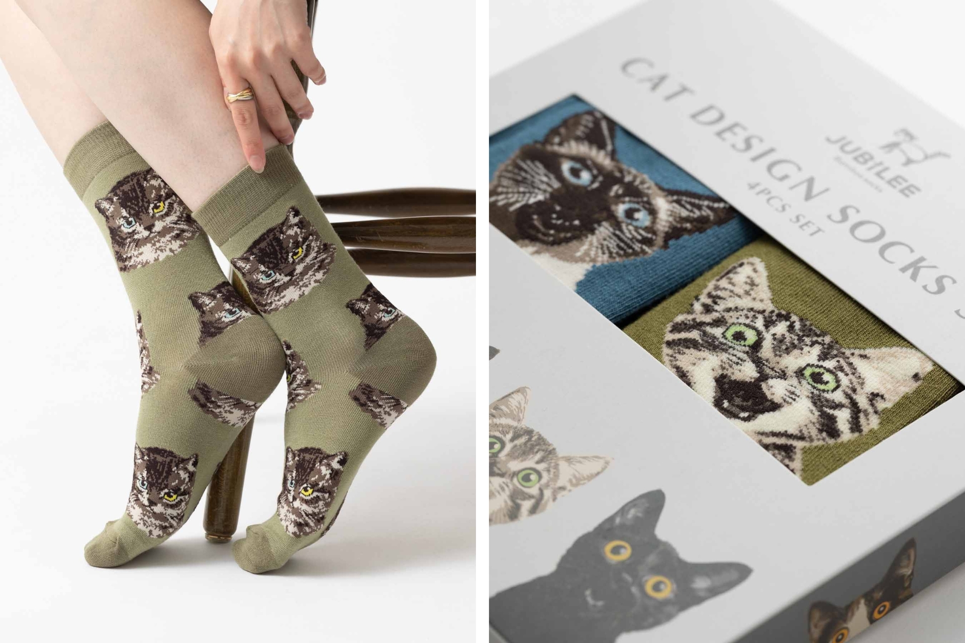 すなわちこれは、夏にぴったりな靴下ということ。びっくりしている子猫やオッドアイの子猫を描いたデザインもかわいいんですわ。猫のほかには、ゴッホの名画の靴下もありますよ~!