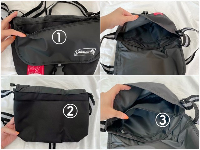 フラップ部分、バッグ内側、背面とバッグのどの面にもポケットがあるので用途に合わせて使い分けできますよ。フラップ部分はファスナー付きなので、アクティブに動きたいときにスマホをさっと入れるのに便利そう!