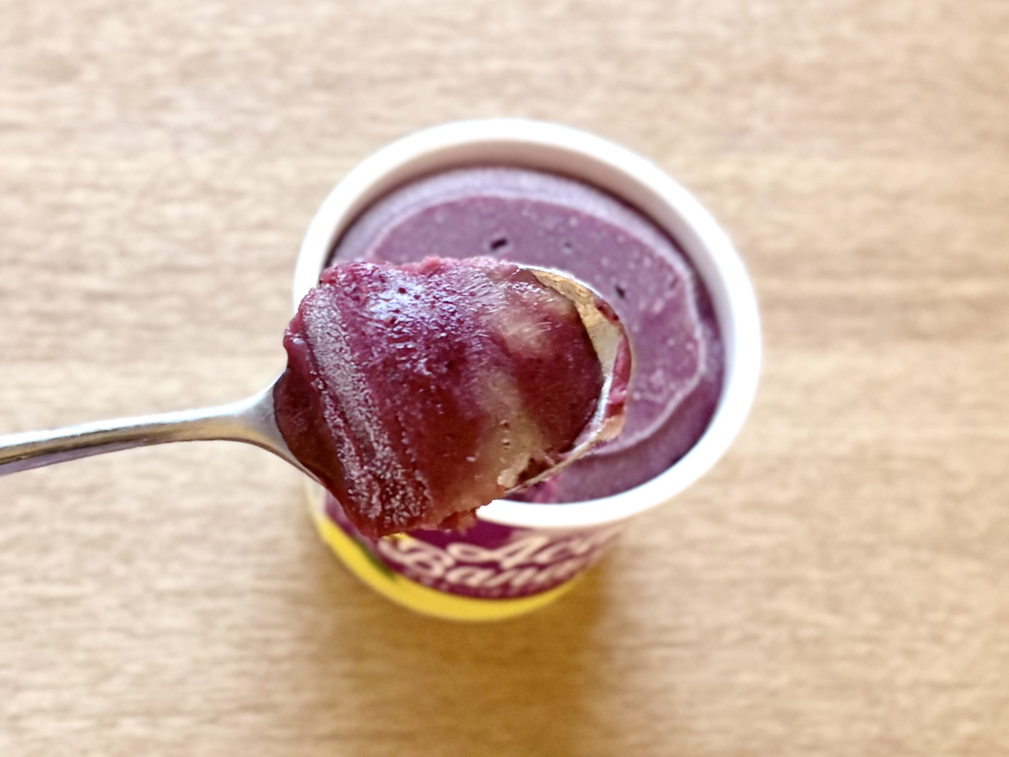 紫色と黄色がほんのり混ざり合うアイスは、とってもフルーティー! しかも、ただ「アサイーとバナナの味がする」ってだけではなく、フルーツそのものの舌触りも感じます。