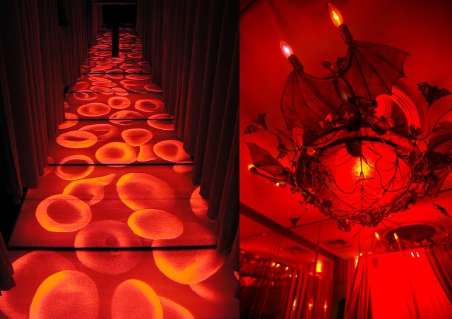 「魔除の十字架」が埋め込まれたフロントスペースや棺桶が鎮座する広間、蝙蝠の飛び交うシャンデリアなど、どこをとっても不気味な魅力に満ちあふれた館内も必見ですよ!
