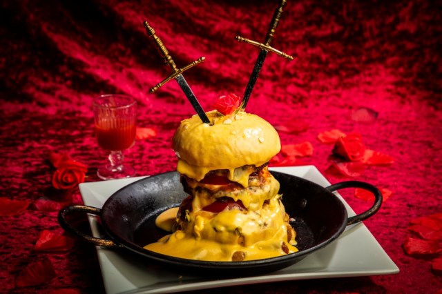 「罪深きブラッディーインフェルノバーガー ~ヴァンパイアカフェ特製 3種のチーズバーガー~」は、肉々しいパテと分厚い輪切りトマトを幾重にも重ね、バンズとともに容赦なくサーベルで貫いた悪魔的バーガー。
