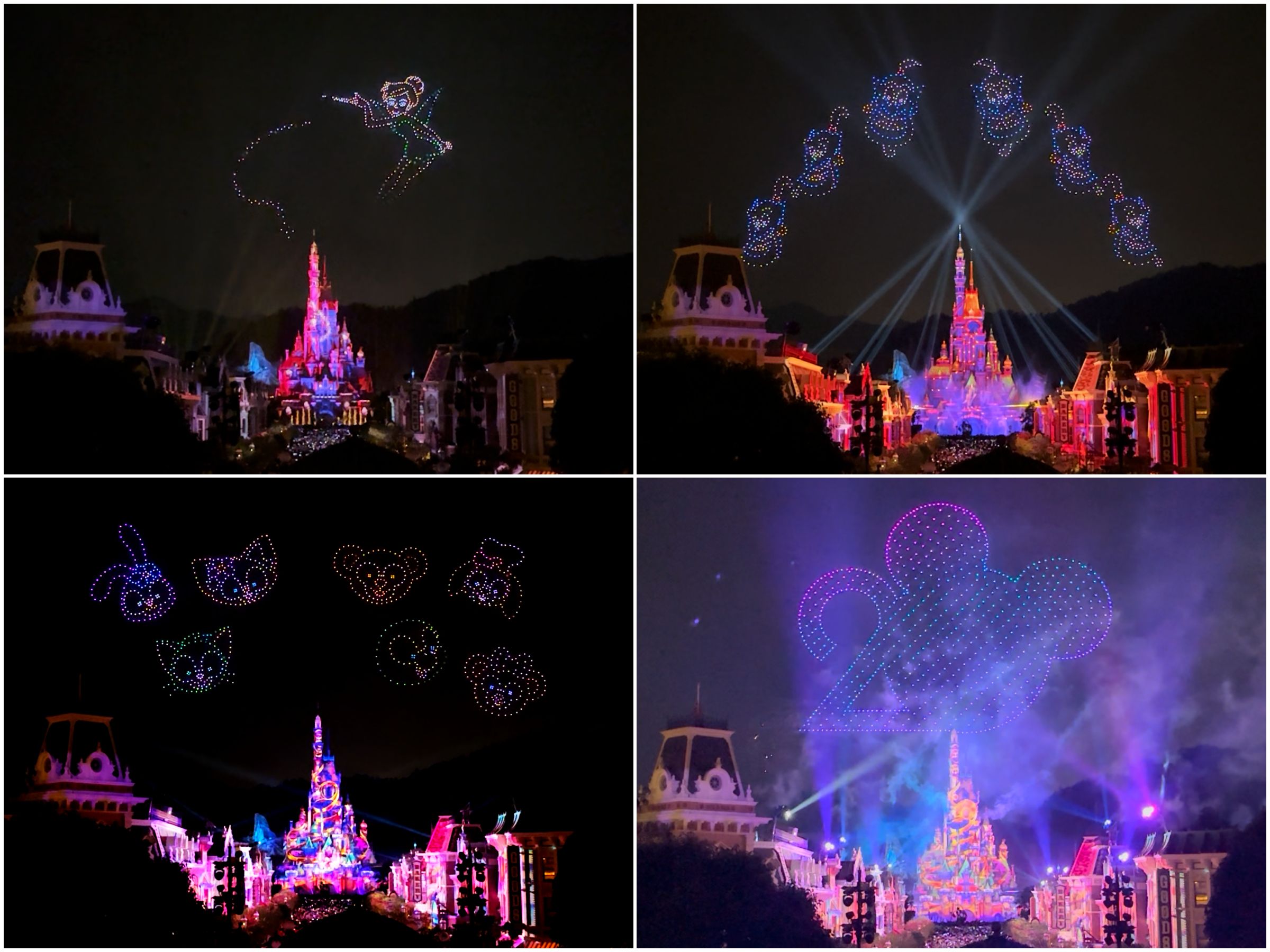 個人的にはドローン演出に終始圧倒されました。ティンカー・ベルがお城に杖を振り、ジーニーが笑い、夜空にダッフィーたちの笑顔が浮かび上がり……とにかく圧巻で、感激と歓声が止まらないんです。