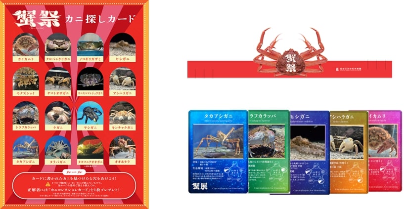館内にいるカニを探す「カニ探しカード」をゲット+「カニおめん」を付けてカニになりきれるプログラムを用意。カニ探しカードをクリアすると、カニの知識がどんどん深まる「カニコレクションカード」をプレゼント。