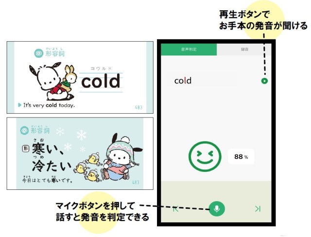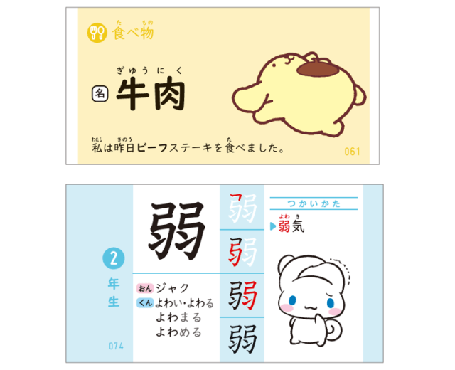 全英単語・全漢字に、ポムポムプリン、シナモロール、ハローキティ、クロミ、ポチャッコ、マイメロディといったキャラクターのイラストが入っていて、可愛い姿やくすっと笑えるユーモラスな姿とともに勉強への意欲を高めてくれます。
