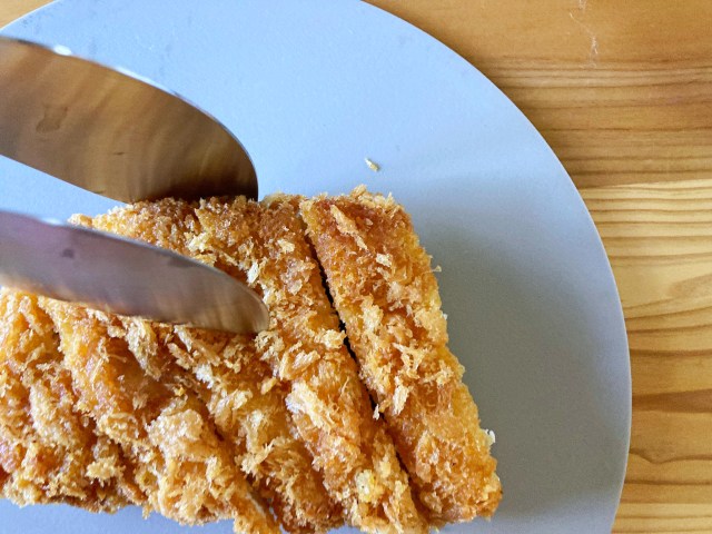 揚げたてのとんかつやコロッケって、熱すぎて切れないときありますよね。 そんなときは指先トングで軽く押さえながら包丁を入れればOK。