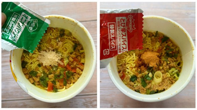 作り方はどちらも同じで、カップに熱湯を入れて3分待つだけ。仕上げに、「マイルド」のほうは「オニオンパウダー入り 特製ふりかけ」、「スパイシー」のほうは「とび辛スパイス」をかけて混ぜ合わせたらできあがりです。