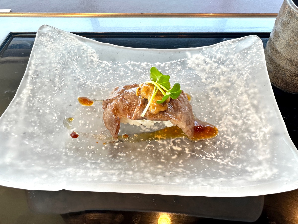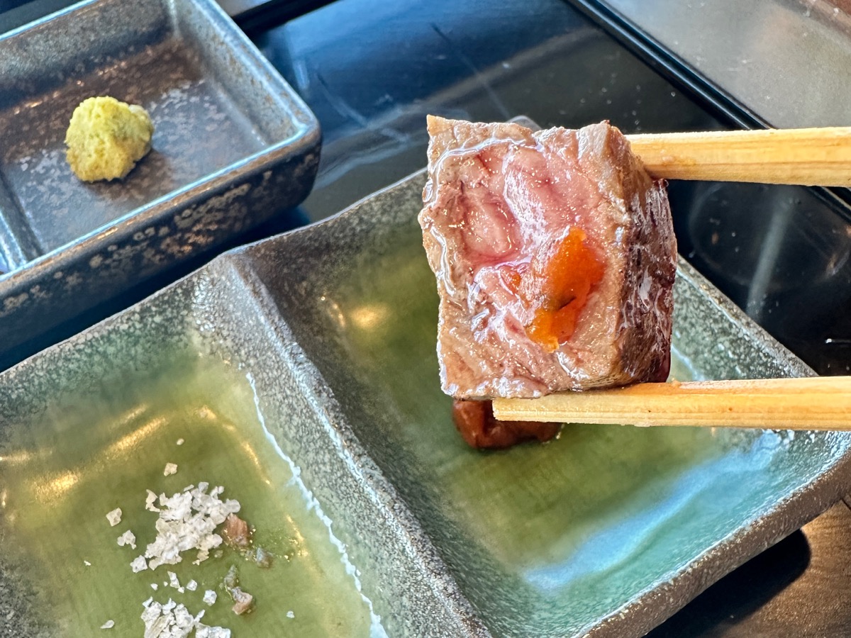 こちらの部位はサーロインとのことで、最初に食べたすき焼きとはまた違う食感と旨味。お肉のやわらかさと甘みを感じる脂が雲丹の濃厚な旨味、さわやかな紀州梅のソースと相性バツグンでした!