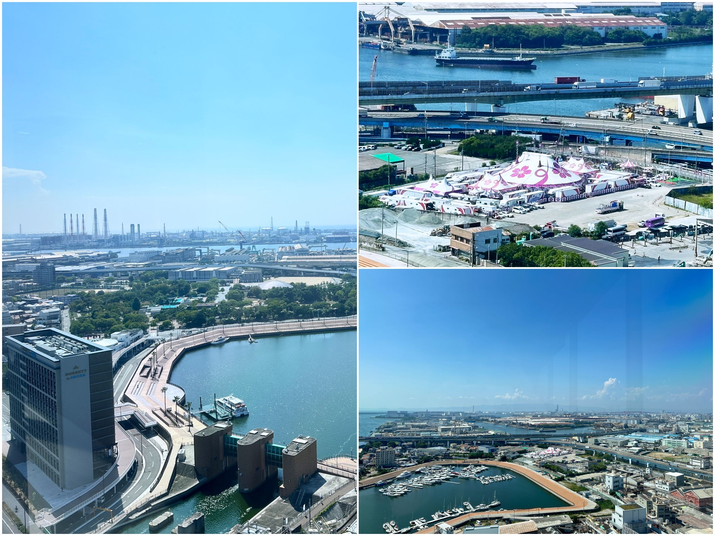 眼下には堺の港に停泊するヨットやミャクミャクデザインの万博シャトル、現在公演中の「さくらサーカス」の天幕が見え、目を凝らすと大阪・関西万博の大屋根リングの姿もとらえることができました。万博会場をこの角度から見られるのは貴重じゃないですか!