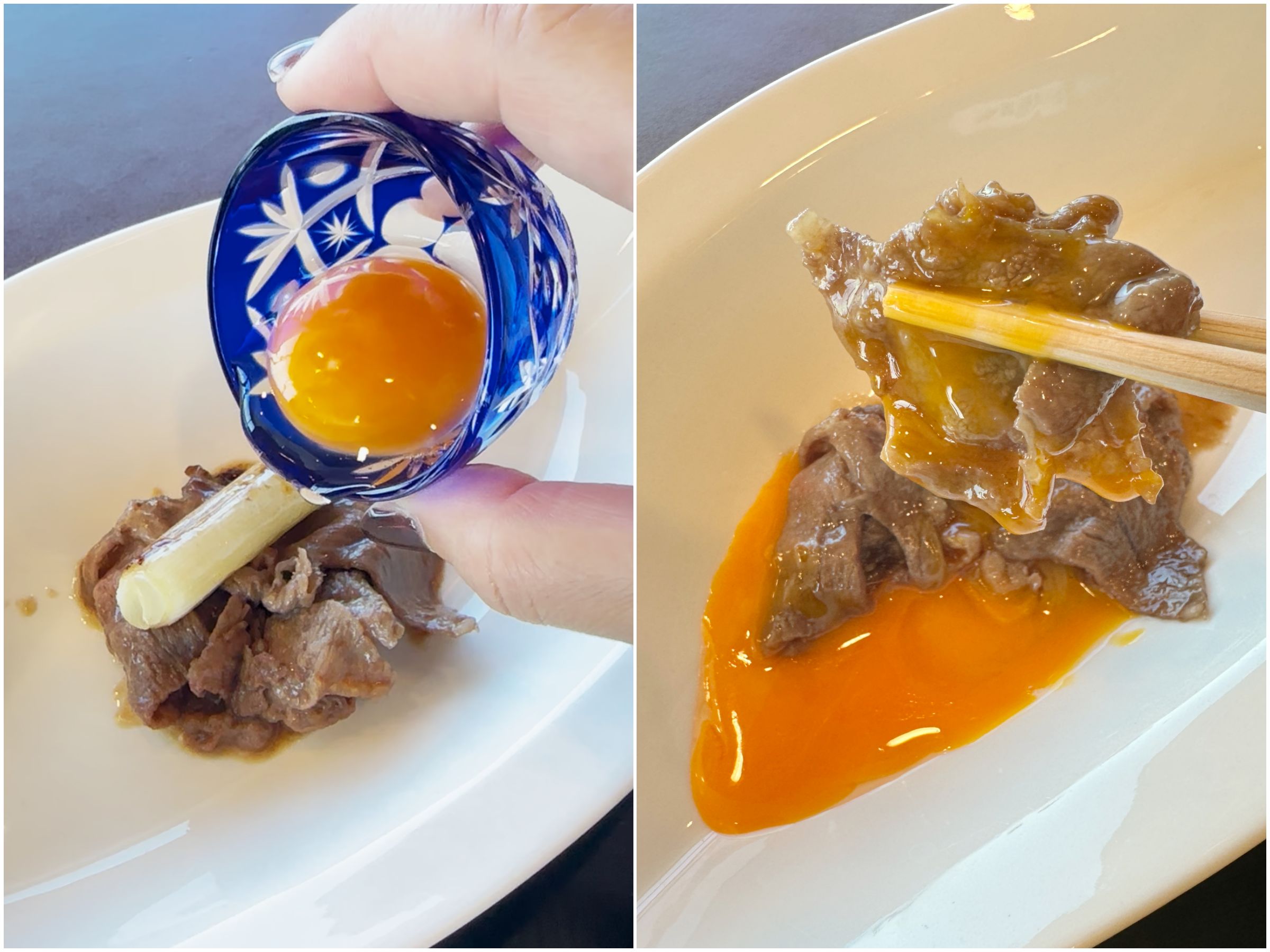 まずは大阪産ウメビーフの鉄板牛SUKIYAKIから。わたあめで甘みをつけるんですって。ワクワク! こういう仕掛けが、おいしさだけじゃなく体験としての食事の質を上げてくれる感じがする。