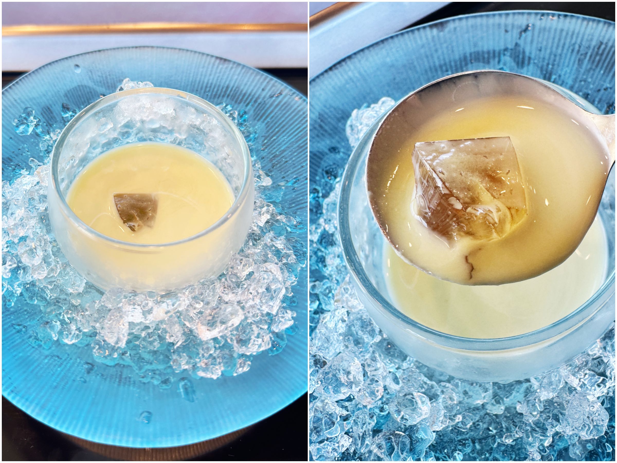 続いては枝豆の冷製スープ。さわやかな枝豆の風味となめらかさのあるポタージュの中にコンソメジュレと枝豆が隠れていました。すき焼きのおいしさでいっぱいになった口を(名残惜しいけれど)リセットしてくれるお味。器も美しい!