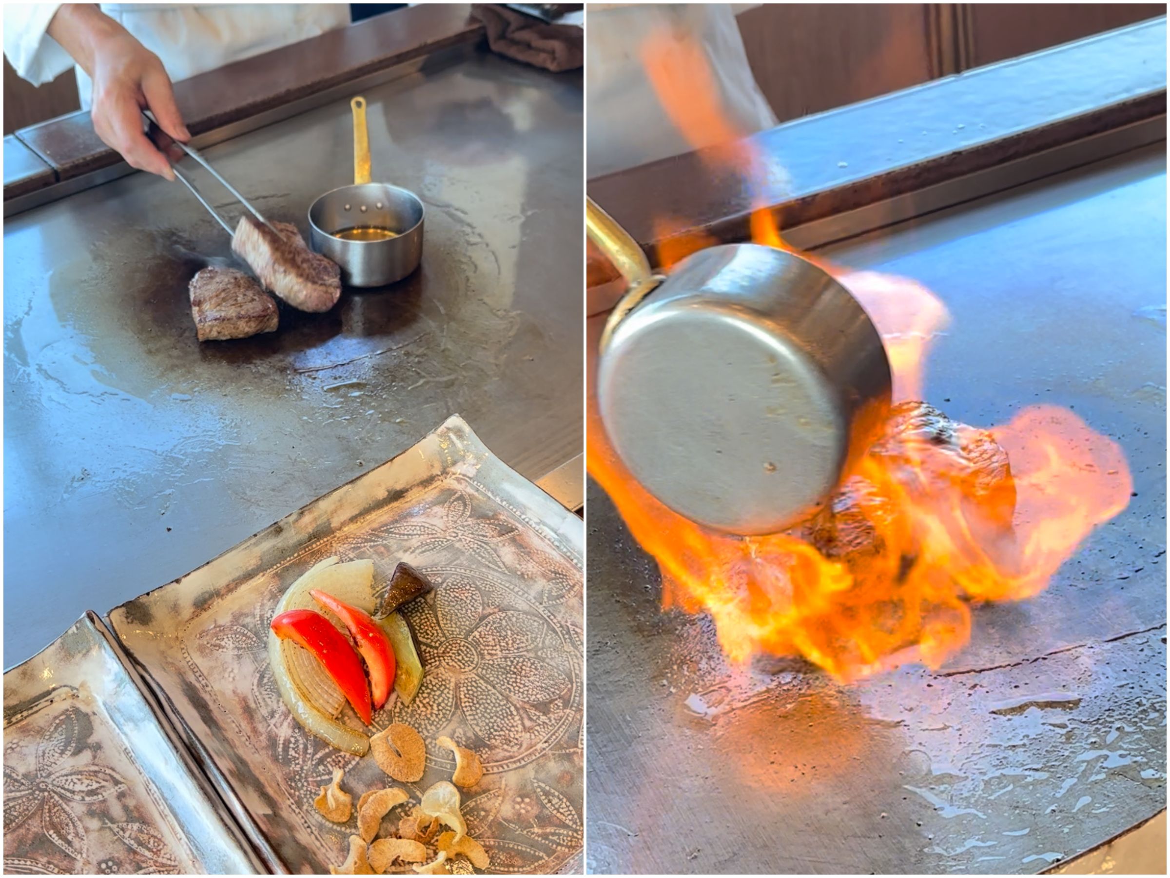 そしてアメリカ産の牛サーロインを目の前で焼き上げてくれるステーキ。焼き加減はミディアムレアがおすすめとのことでした。炎がブワッと立ち上がるフランベ、目の前で見るとめちゃくちゃテンション上がります……!