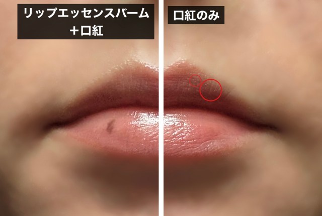 パッと見るとあってもなくても違いはないように見えますが、保湿されている感覚が明らかに違います。それに、よ〜く見るとすっぴん唇に塗った方は皮むけがカバーしきれていません。