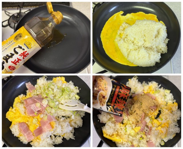 フライパンにごま油を入れて熱したら、溶いた卵、ご飯の順に入れます。続いてベーコン、ネギを加えて軽く火が通ったら、「麻辣チャーハンの素」をれて炒め、全体にまんべんなく色がついたらできあがり♪
