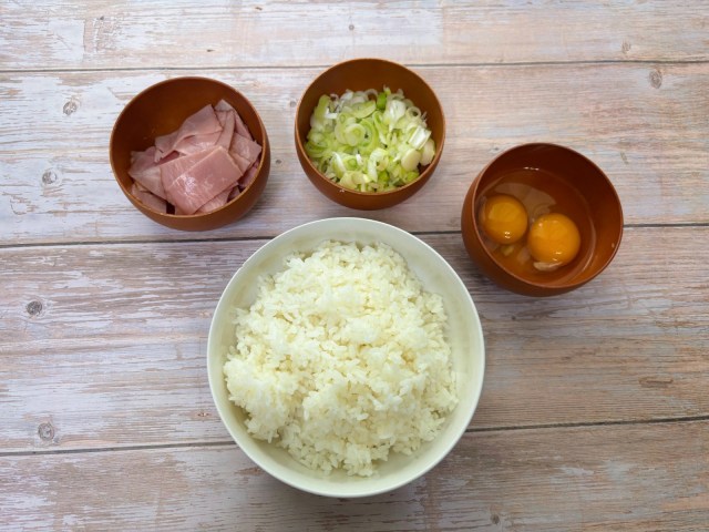 では、さっそく作っていきましょう。自分で用意する材料は、炊いたごはん(400g)、ベーコン(50g)、ネギ(50g)、全卵(2個)になります。