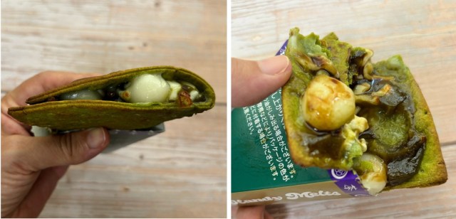 ……うーん、ひとくちめから濃厚なお抹茶味! 生地の中には祇園辻利の抹茶を100%使用した抹茶餡が入っているため、ほろ苦くもまったりとした甘さが口の中いっぱいに広がります。後がけした黒みつも、さらに深い甘みを加えていますね。