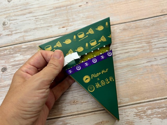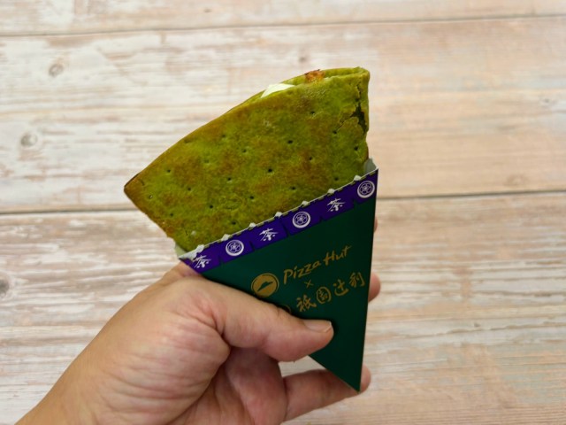 ピザハットから販売中の片手で食べられるお手軽なピザ「ハンディメルツ」。2025年9月1日に登場したのは、京都・祇園の老舗「祇園辻利」と初コラボレーションした「ハンディメルツ 抹茶白玉黒みつ」ですっ。