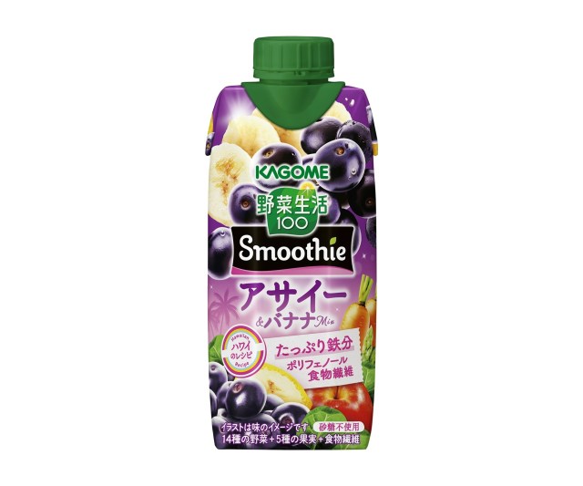 カゴメの「野菜生活100 Smoothie」シリーズは、野菜や果実を活かした味わいと飲みごたえが特長の濃厚スムージー。こちらはアサイーのフルーティーな酸味とバナナの優しい甘みを楽しめます。