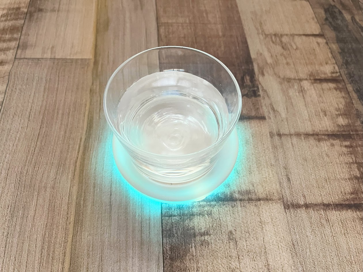 水を入れたコップをコースターのうえにセットして、そのまましばらく置いておいたら……10分経過したところでコースターが青く点滅ッ! どうやらこれが「飲み忘れてますよ」という合図のようです。