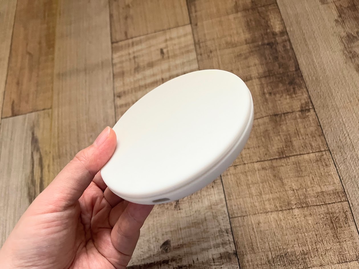 編集部に実物が届いたのでさっそくチェックしてみましたが、第1印象は「シンプルなデザインのコースター」という感じ。側面にあるスイッチと充電用ケーブル差し込み口が “デバイスっぽさ” を醸し出しています。