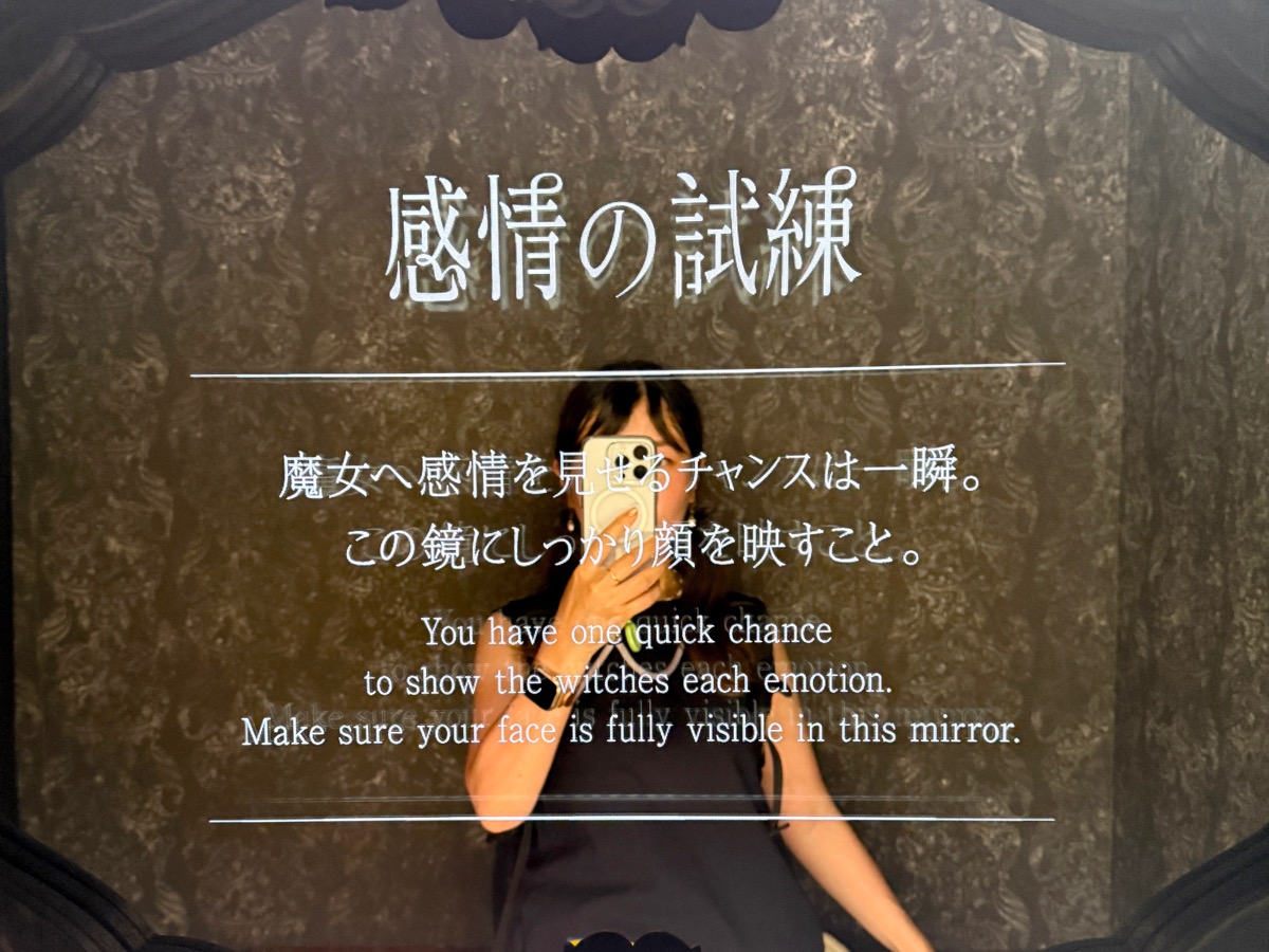 魔女たちが待つ個別ブースへ入ると大きな鏡とご対面。いよいよ感情を見せるとき……気合い入れて表情を作りますよぉ。