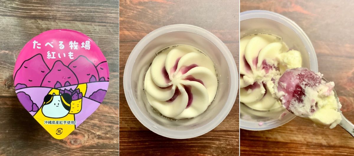 人気シリーズ「たべる牧場」の紅いも味はミルクアイス・紅芋あん・紅芋アイスが重なって見た目にも華やか。アイス・あん・ソースの全てに紅芋が使われているから、紅芋好きさんは必食です。