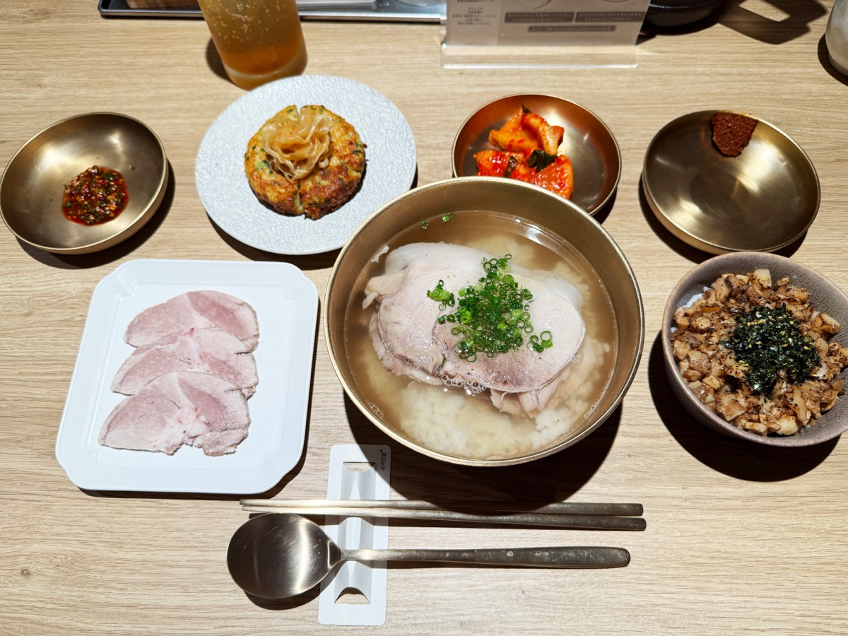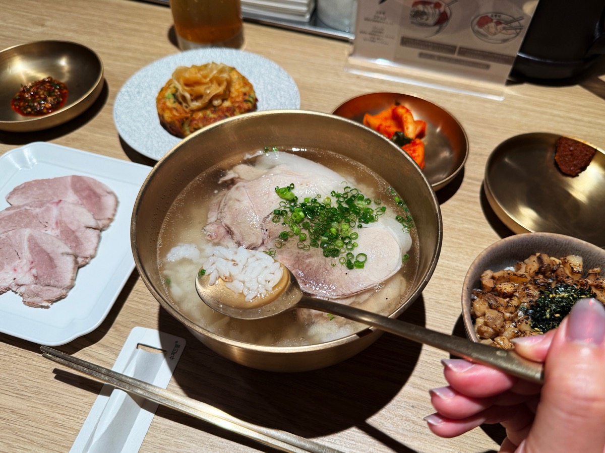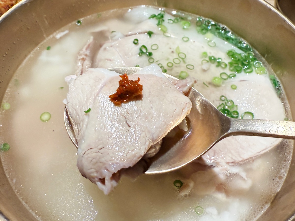 まずはスープからひとくち。豚肉のスープとは思えないほど繊細な旨味が染み渡る……! 旨みが強い豚ウデと香味野菜をじっくり煮込み、味付けは塩のみとのことですが、奥深い味わいを何度もたしかめたくなります。コムタンってこんなに美味しいんだ……。