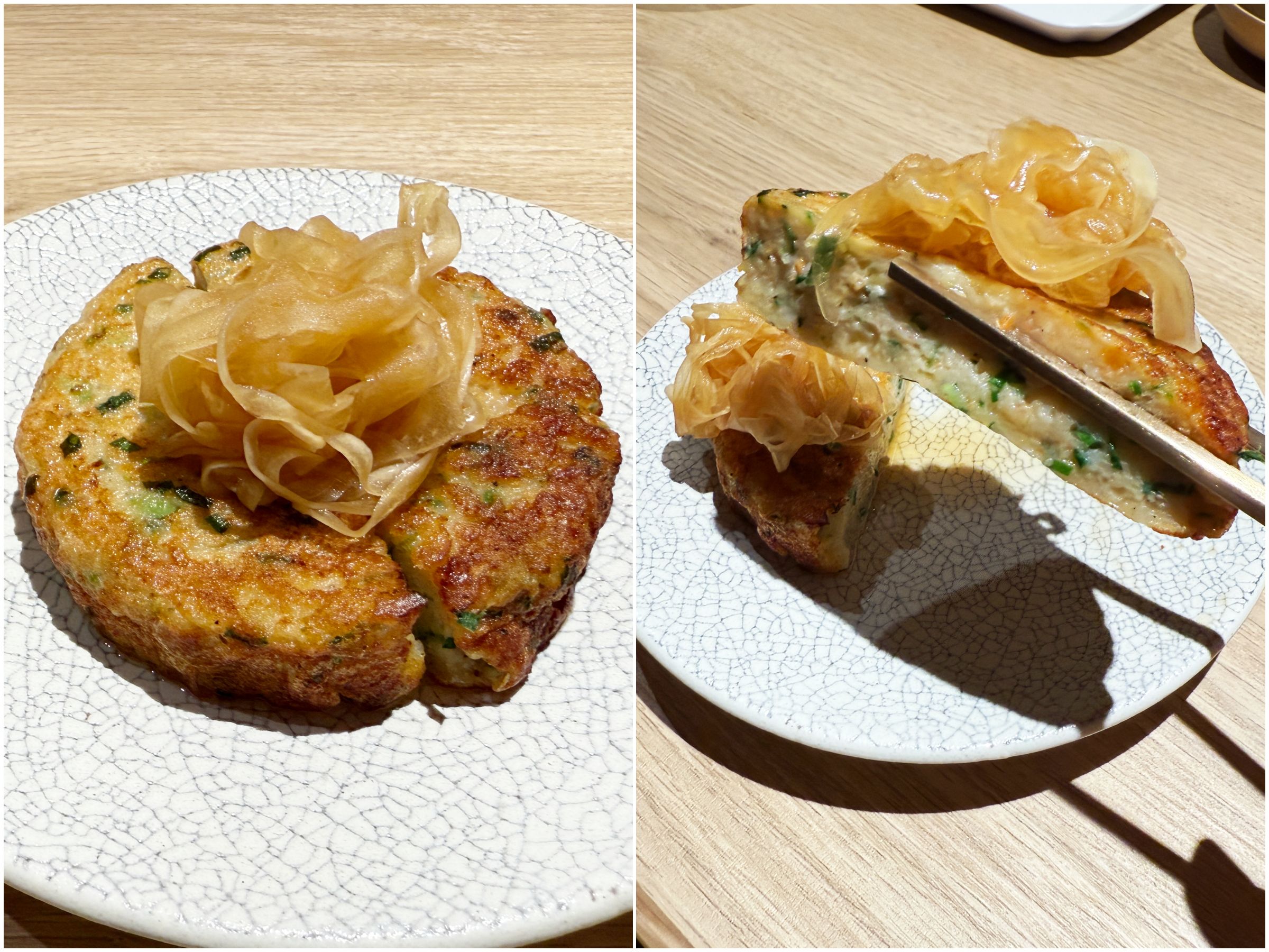 「海老ドングランテン」は細かく刻んだエビと野菜を使った焼きかき揚げだそう。外側はカリッ、中はフワッとした食感で、豚脂の旨味とエビの風味がギュッと押し寄せてきます。添えられた玉ねぎが酸っぱ辛くて、さっぱりと食べられました。