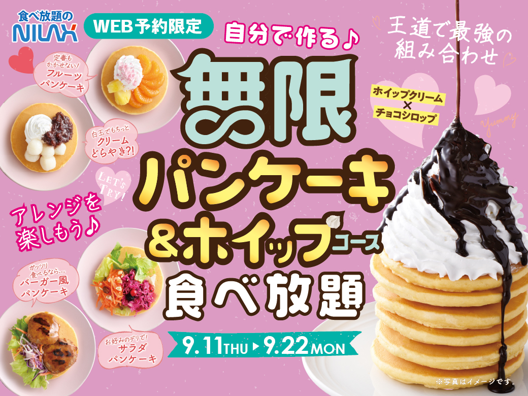 ニラックスブッフェではパンケーキ&ホイップクリームの食べ放題を9日間限定で実施中。なんとアレンジし放題なので(!)自分史上最強のパンケーキと出会えちゃうかもよ。