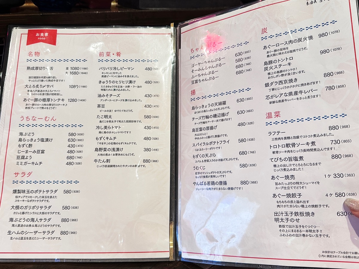 さっそくメニューを開いてみると「うちなーむん(沖縄のもの)」として海ぶどうや島らっきょう、じーまーみ豆腐などがあるほか、もずくキムチにゴーヤーチャンプルーにラフテーなど、食べたい琉球料理がズラズラ並んでいます。