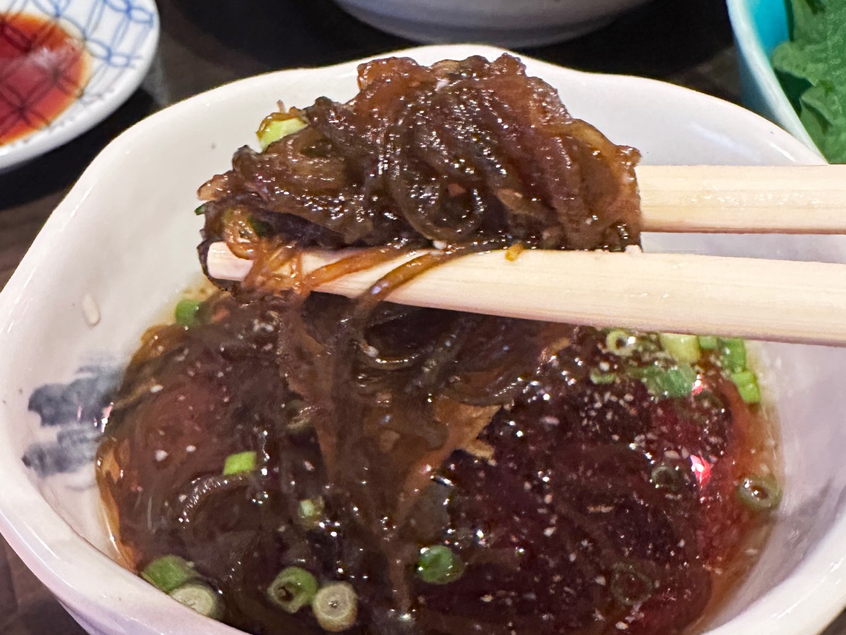 最後にご紹介したい料理が「うむくじ」。名前を知ったのも食べたのも、この日がはじめてです。名前からだとどういう料理か想像もつかないし、見た目も地味なんですが……これがもう、めちゃくちゃ美味しかった!!!!
