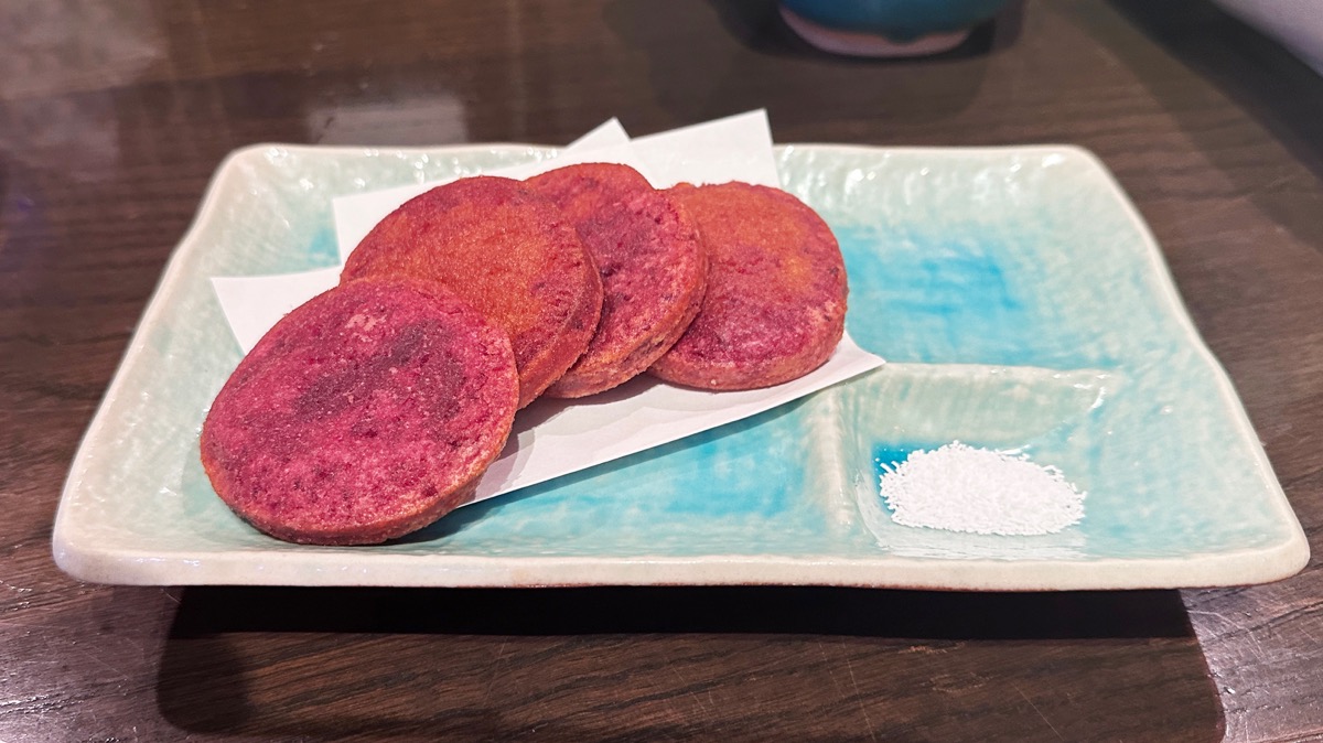 マッシュした紅芋を揚げたもので、いわば沖縄版いももち。「うむくじ」=「芋くず」で、サツマイモのデンプンのことなんだとか。小腹が空いてるときにスーパー行くとつい店頭の焼きいも買っちゃう私のようなオイモスキーには、猛烈にハマるお味でした。
