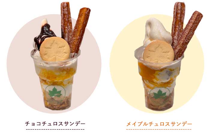 ロゴスカフェでは、人気商品「チュロスサンデー」をリニューアルしたメイプルフェスタ特別メニューを提供。チョコとメイプルの2つの味から好きなほうを選べます。