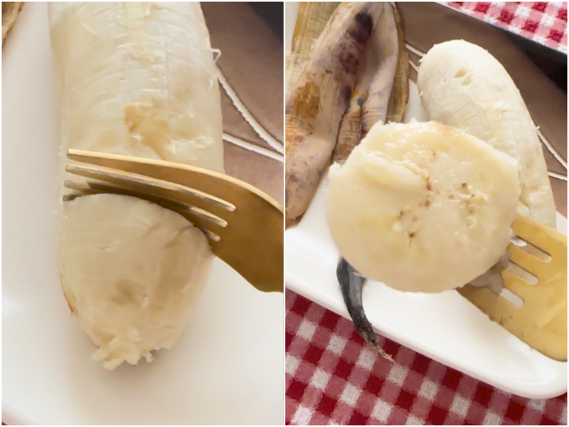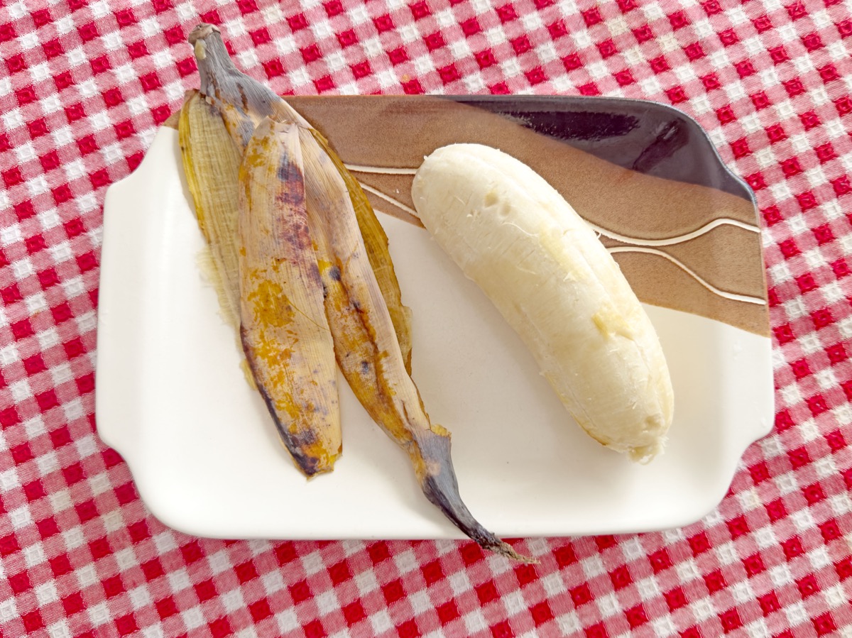 見た感じ、普通のバナナならわりとアウトな状態まで追熟した銀バナナを、いよいよ食べていきたいと思います。中も真っ黒だったらどうしよう。ドキドキしながら皮をむいてみると……。