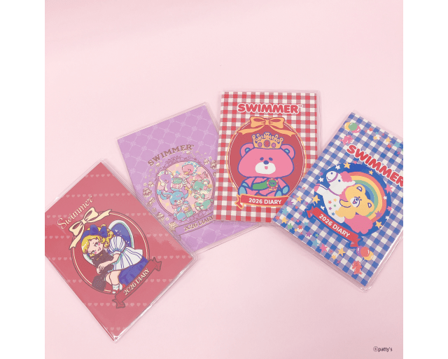 ファッション小物や文具を展開する「スイマー(SWIMMER)」とコラボしたスケジュール帳はポップなカラーの4種類。おなじみの動物たちがあしらわれたデザインや、ちょっぴりレトロな女の子が描かれたデザインなどがラインナップしています。