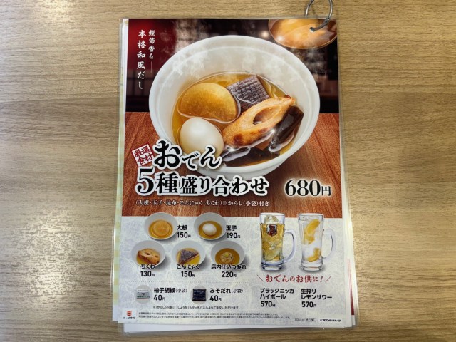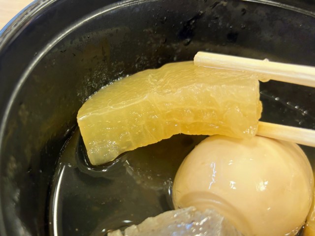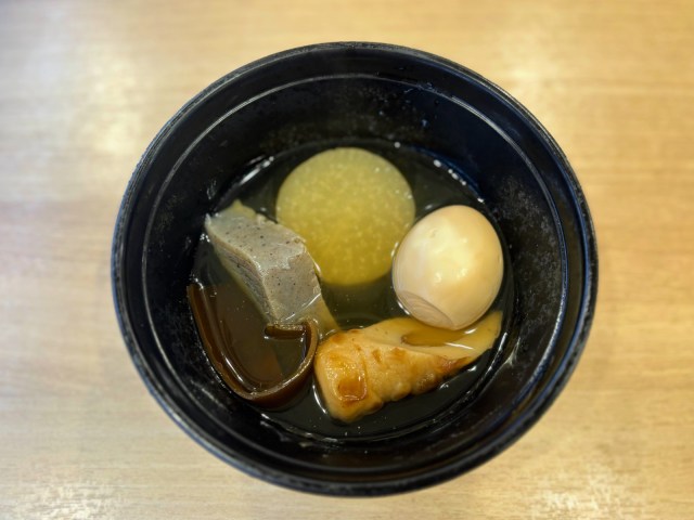 他の具材も大根同様に味が染みていておいしかったのですが、こんにゃくやちくわ、昆布については小ぶりで薄めなのが気になったところ。値段はコンビニのおでんより少しだけ高めですが、それだけに多少の割高感を感じてしまったのが正直なところです。