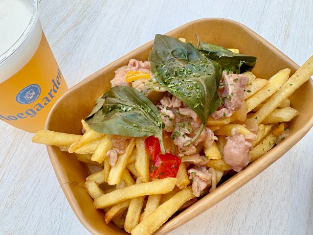 1番の注目は、ベルギーでホワイトビールと共に国民食として愛される「フライドポテト」(1200円)。遊び心あふれる5種類のフレーバーソースの中から、今回は「ガパオ」を試食しました。