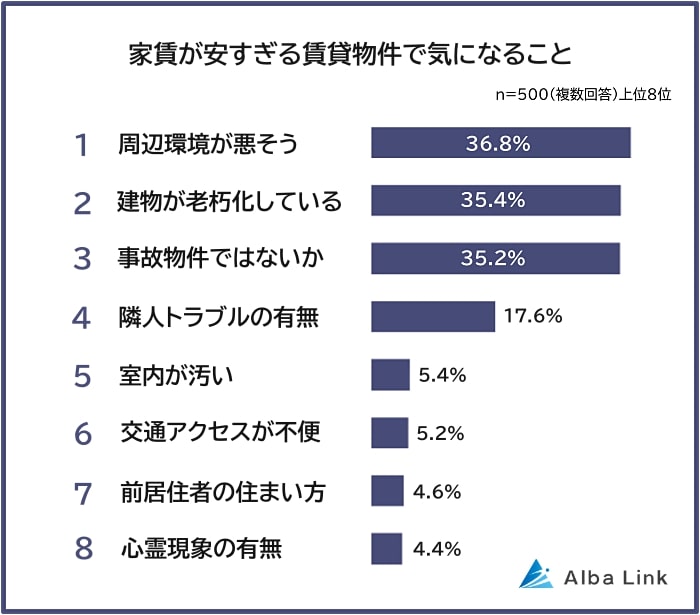 また、家賃が安すぎる賃貸物件で気になること1位は「周辺環境が悪そう」でした。2位以下の結果はこちら!