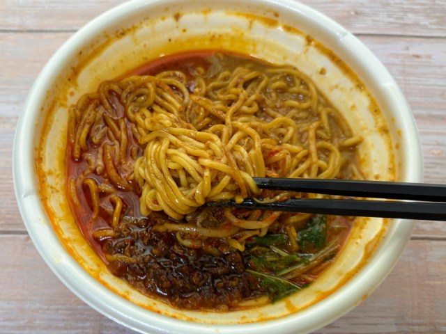 まずは麺を口にしてみると……わ、かっら!!! 容赦のない辛さに口の中が燃え上がり、こちらのボルテージも一気にヒートアップします。