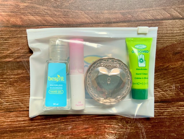 ジップ袋の裏面はクリアで何が入っているかが一目でわかります。リップやミニサイズのコスメが入るサイズです。防災用に使うなら薬や絆創膏をまとめておいてもいいかも!
