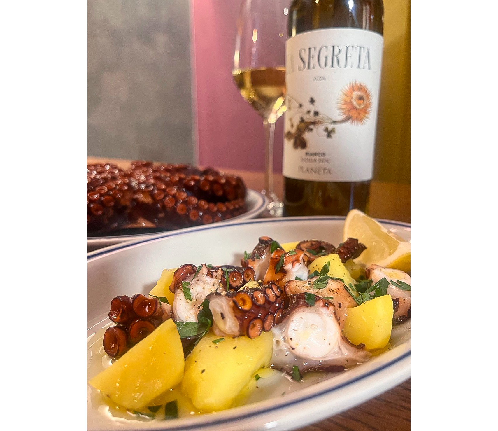 茹でたタコをシンプルにオリーブオイルとレモンで味わうシチリア屋台の定番メニュー「タコのボッリート」は、ぜひシチリアワインといただいちゃって。