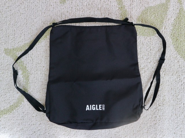 黒地にホワイトのロゴが入ったシックなデザインが素敵。ザラっとした手触りの薄手の生地が使われていて、上部はジップファスナーで開け閉めできるようになっています。