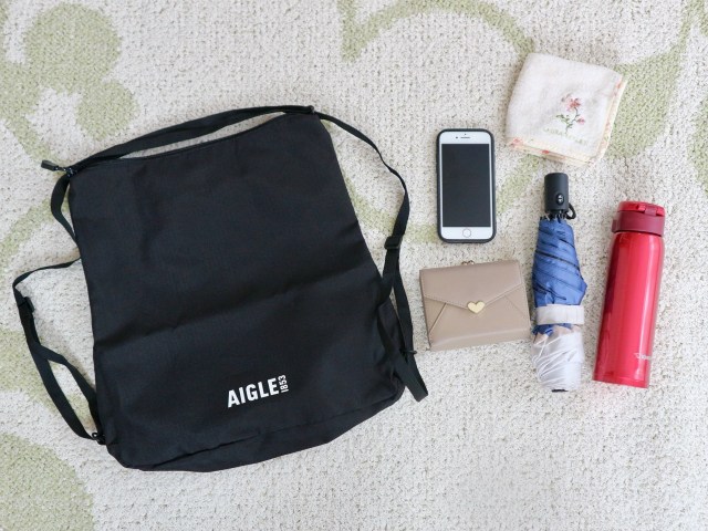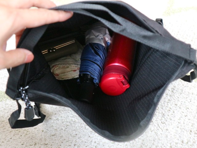 さっそく、普段よく持ち歩く財布やスマホ、ハンカチなどの最低限の荷物に加えて、大きめの水筒や折りたたみ傘を入れてみたいと思います。