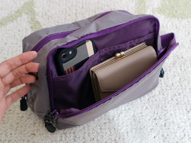 二つ折り財布がしっかりと収納でき、ポケットの部分には小さめのスマホがすっぽりと入りました。細々としたものを整理して収納するのにいいかも。